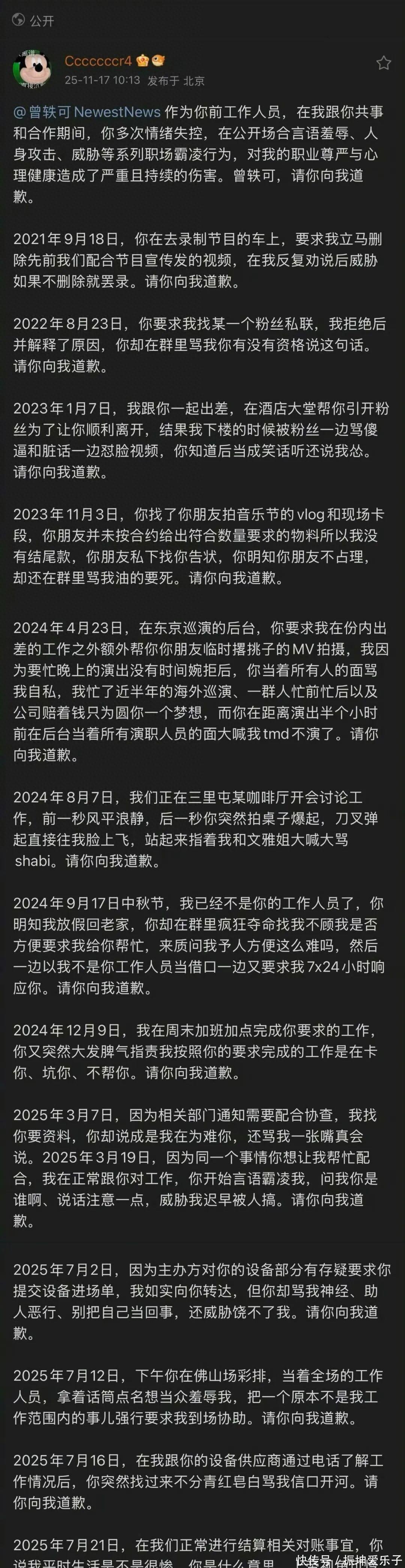 你们刷到曾轶可前同事的爆料没?有网友直接吐槽 “现在的明星到底狂什么”,把憋了好几年的委屈全倒了出来!缘由是 11 月 14 号她收到曾轶可团队的通知,让她别乱说话,这换谁能咽下这口气?人家直接在微博上爆料,说曾轶可当初不光言语刻薄,甚至还有过肢体冲突,看着真是让人心寒,妥妥的打工人辛酸史啊。 这可不是她第一次陷负面。2019 年首都机场那事儿还记得不?官方说她走自助通道时,民警让脱帽做人脸识别,她拒不配合还恶语相向。更过分的是,事后她发微博叫嚣 “骂你家人又怎样”,还晒出 6 张工作人员证件正规配资平台app,明着引导粉丝网暴。最后官方通报,她成了劣迹艺人,沉寂好久才靠综艺、演出慢慢回归。